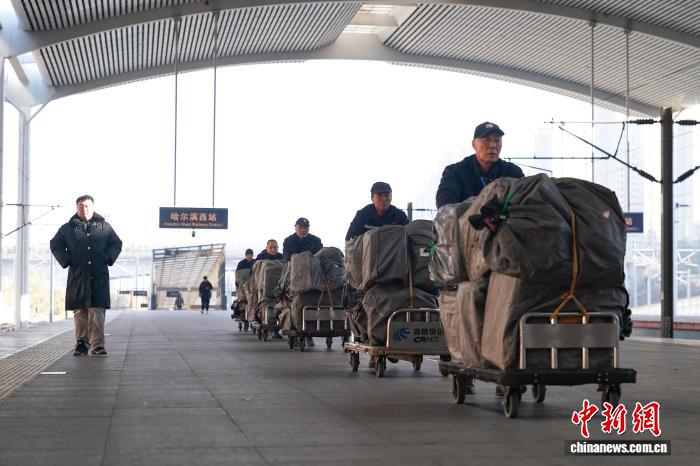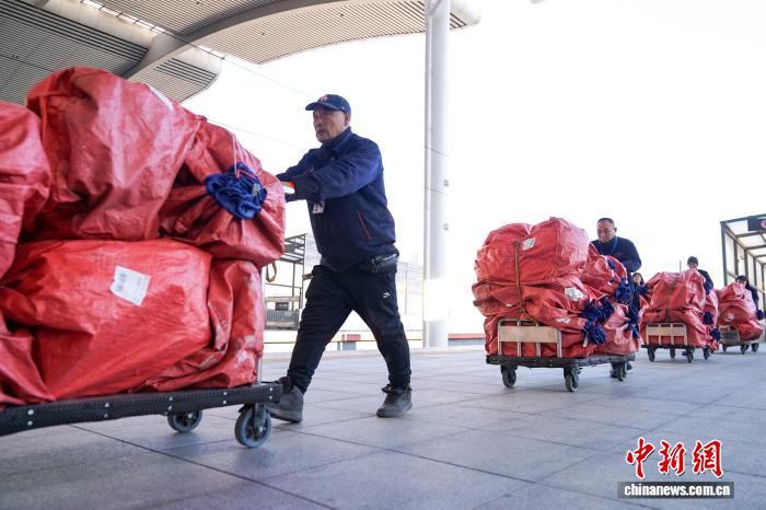图为任务职员正在站台上运送速件。中新社记者 赵宇航 摄