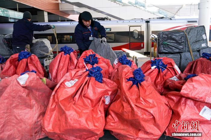 图为任务职员正在站台上整治速件。中新社记者 赵宇航 摄