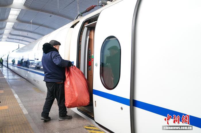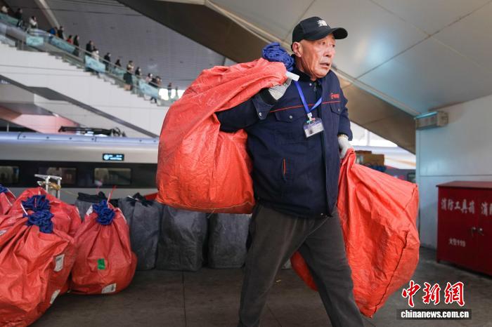 图为任务职员正在站台上运送速件。中新社记者 赵宇航 摄